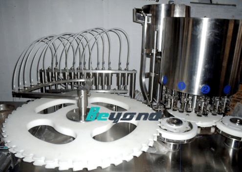 Он использует погружную заливку, наполненная головка автоматически вставляется в бутылку, чтобы убедиться, что она не переполнена. Материал поверхности рабочего стола - нержавеющая сталь. Вся машина спроектирована в соответствии с требованиями GMP.